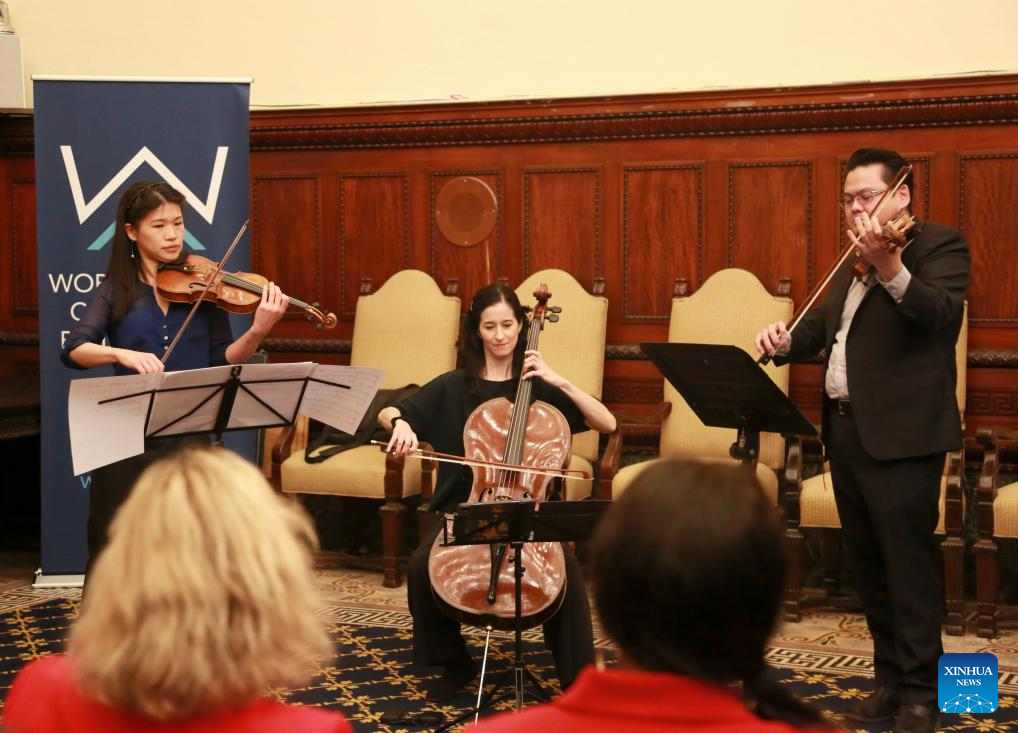 Musicians from the Philadelphia Orchestra play musical pieces at the Philadelphia City Hall in Philadelphia, the United States, April 23, 2024. Tianjin in north China and Philadelphia on the U.S. East Coast celebrated their 45-year sister city ties Tuesday, vowing to deepen cooperation and exchange in various fields. (Xinhua/Liu Yanan)