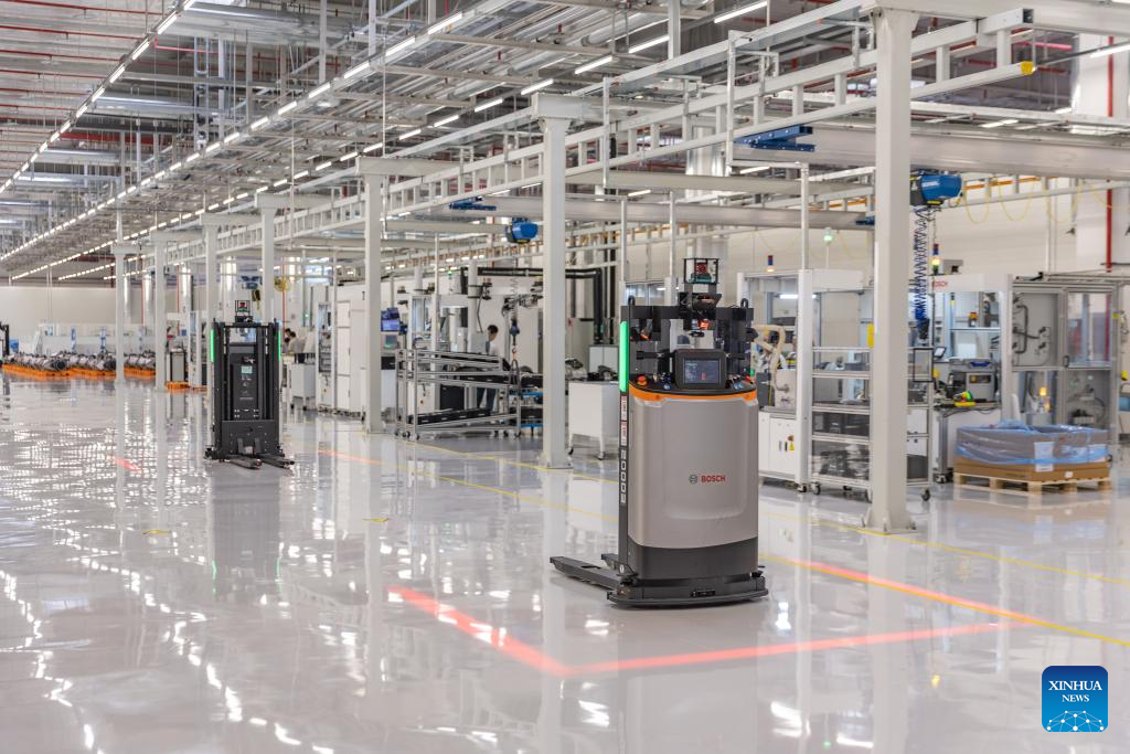 Intelligent AGVs (Automated Guided Vehicles) work at Bosch Hydrogen Powertrain Systems (Chongqing) Co., Ltd. in southwest China's Chongqing Municipality, April 19, 2024. (Xinhua/Huang Wei)