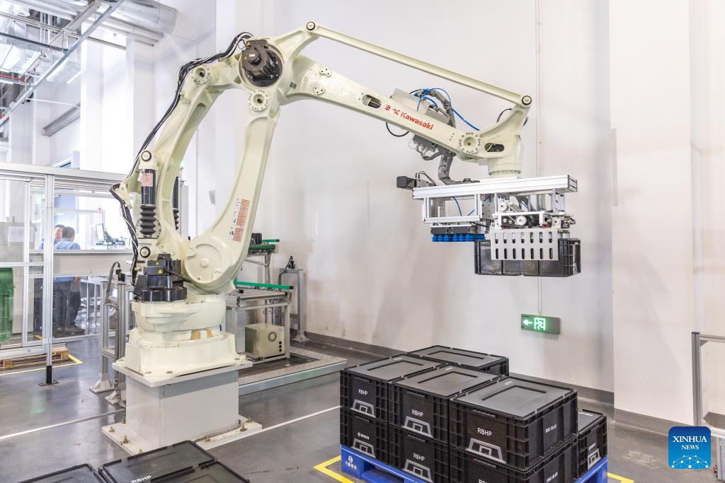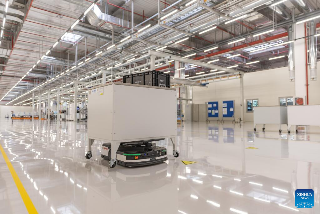A smart robot transfers components at Bosch Hydrogen Powertrain Systems (Chongqing) Co., Ltd. in southwest China's Chongqing Municipality, April 19, 2024. (Xinhua/Huang Wei)