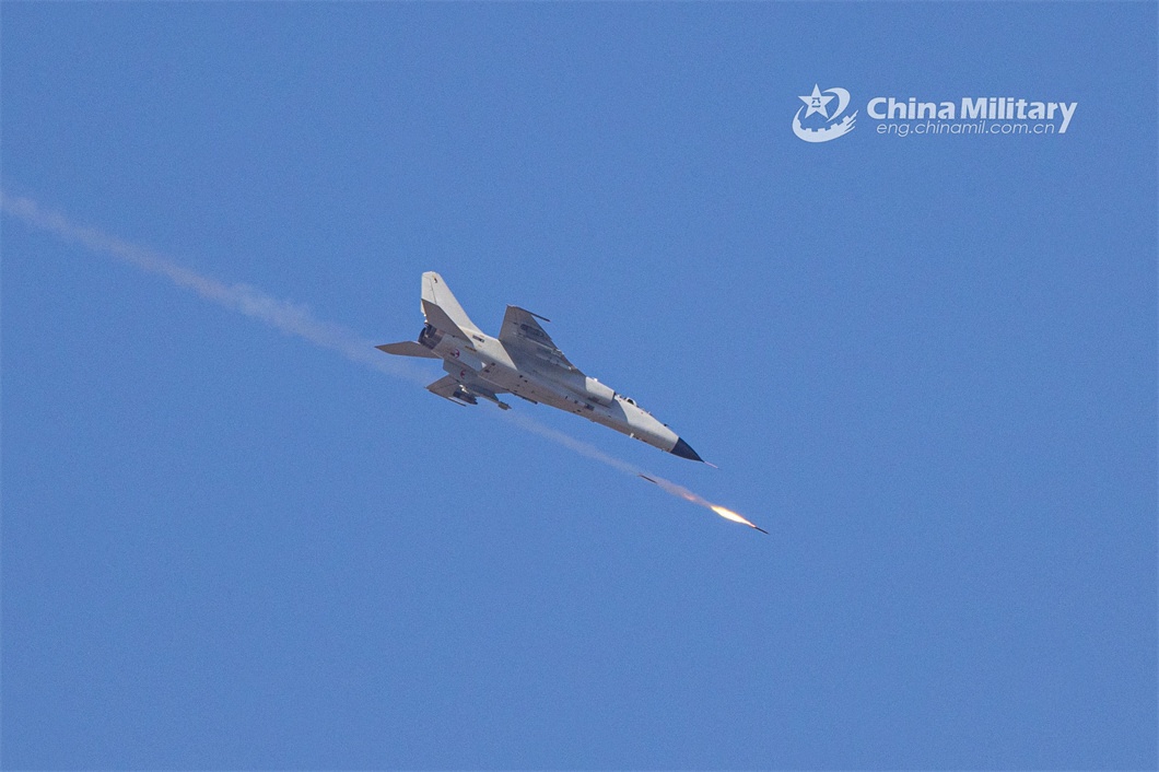 A fighter-bomber attached to an aviation brigade with the air force under the PLA Northern Theater Command soars in the sky during a live-fire training exercise on April 8, 2024. (eng.chinamil.com.cn/Photo by Zhang Yue)