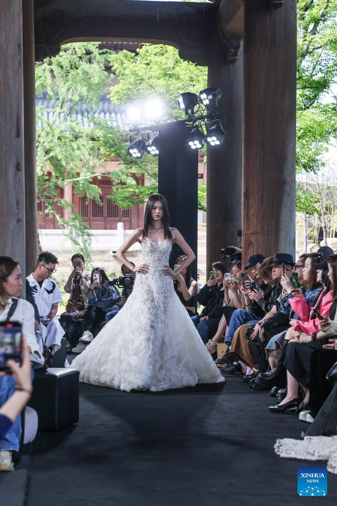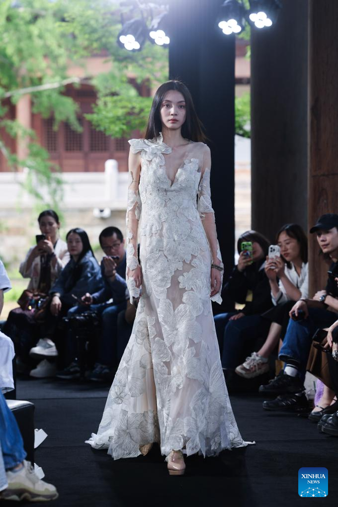 A model presents a creation at the VERA WANG VIP show during the Puyuan fashion week at the Puyuan Fashion Resort in Puyuan Town of Tongxiang City, east China's Zhejiang Province, April 24, 2024. Puyuan is a major knitwear center in China with strong manufacturing capability. The fashion week is held here on Wednesday, hoping to put local knitwear on the global fashion podium. (Xinhua/Xu Yu)