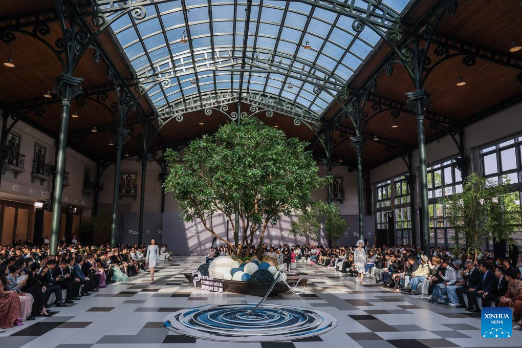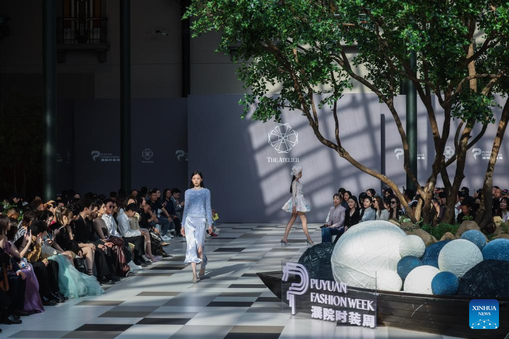 Models present creations at THE ATELIER show during the Puyuan fashion week at the Puyuan Fashion Resort in Puyuan Town of Tongxiang City, east China's Zhejiang Province, April 24, 2024. Puyuan is a major knitwear center in China with strong manufacturing capability. The fashion week is held here on Wednesday, hoping to put local knitwear on the global fashion podium. (Xinhua/Xu Yu)