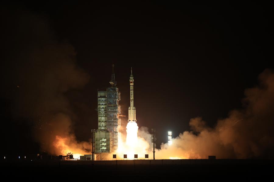 The spaceship, atop a Long March-2F carrier rocket, blasted off at 8:59 p.m. (Beijing Time) from the Jiuquan Satellite Launch Center in northwest China.