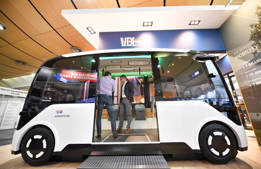 People look at a self-driving shuttle bus at Hannover Messe in Hannover, Germany, on April 23, 2024. (Xinhua/Ren Pengfei)