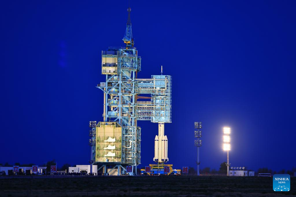 This photo shows the Shenzhou-18 manned spaceship atop a Long March-2F carrier rocket at the Jiuquan Satellite Launch Center in northwest China, April 25, 2024. (Xinhua/Li Gang)
