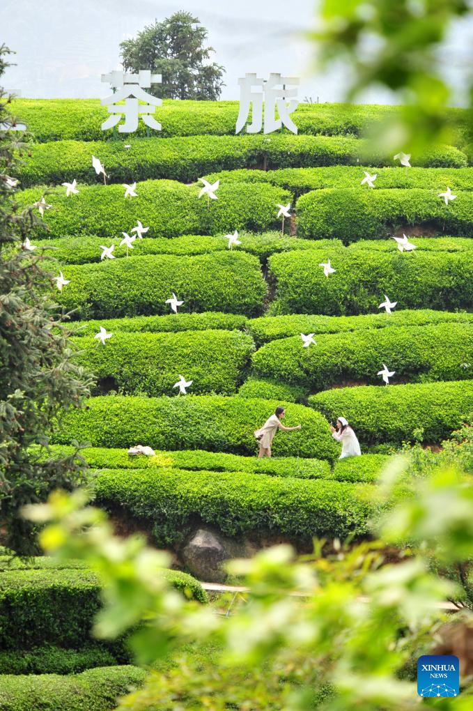 Tourists visit a tea garden in Dengcun Township of Yichang City, central China's Hubei Province, April 27, 2024. (Photo by Zhang Guorong/Xinhua)