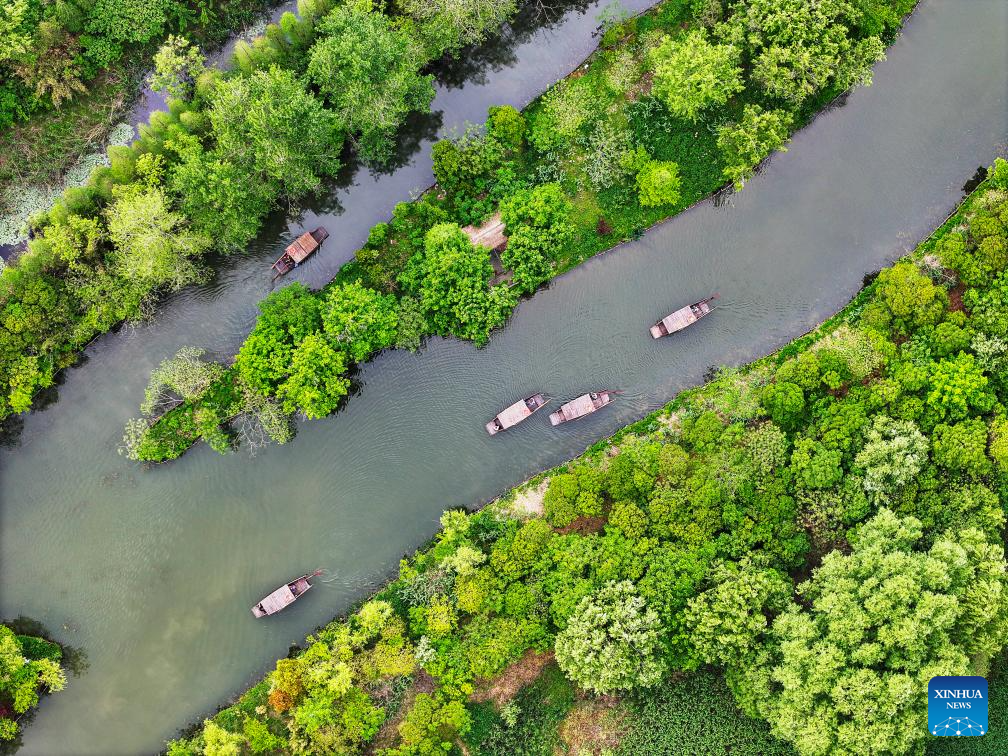 An aerial drone photo taken on April 27, 2024 shows tourists taking boats for sightseeing at Qinhu National Wetland Park in Jiangyan District of Taizhou, east China's Jiangsu Province. (Photo by Zhou Shegen/Xinhua)