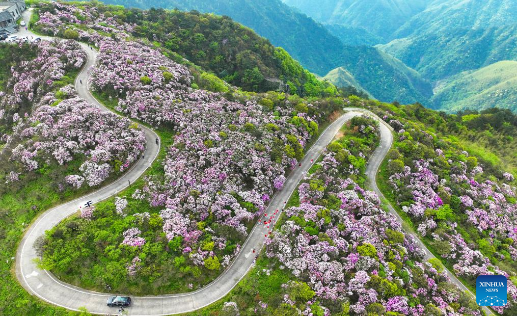 An aerial drone photo taken on April 26, 2024 shows tourists enjoying the spring scenery at a national forest park in Yongzhou City, central China's Hunan Province. (Photo by Zhou Xiuyuchun/Xinhua)