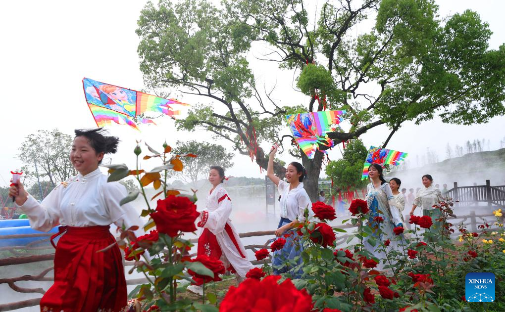 Children fly kites at a rose garden in Zhuhui District of Hengyang City, central China's Hunan Province, April 27, 2024. (Photo by Cao Zhengping/Xinhua)
