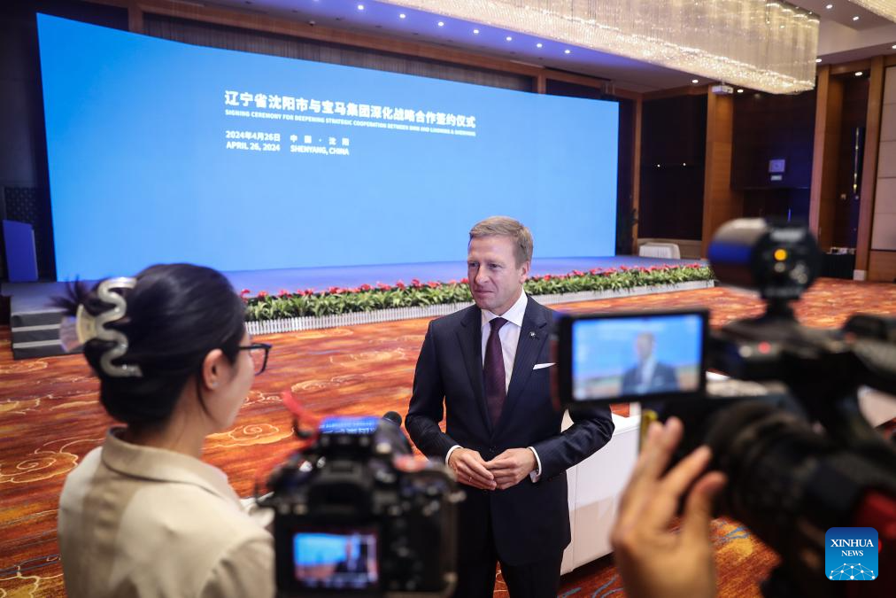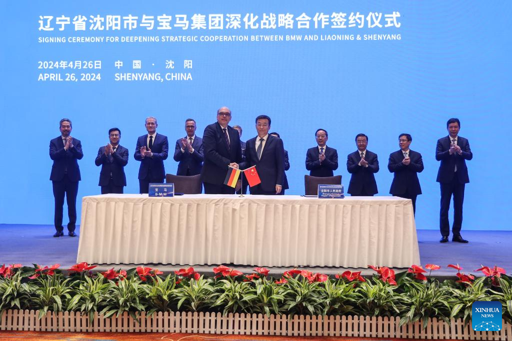 This photo taken on April 26, 2024 shows a scene at the signing ceremony for deepening strategic cooperation between BMW and Shenyang, in Shenyang, northeast China's Liaoning Province. German carmaker BMW announced on Friday an additional investment of 20 billion yuan (about 2.81 billion U.S. dollars) in its production base in Shenyang, capital of northeast China's Liaoning Province. (Xinhua/Pan Yulong)