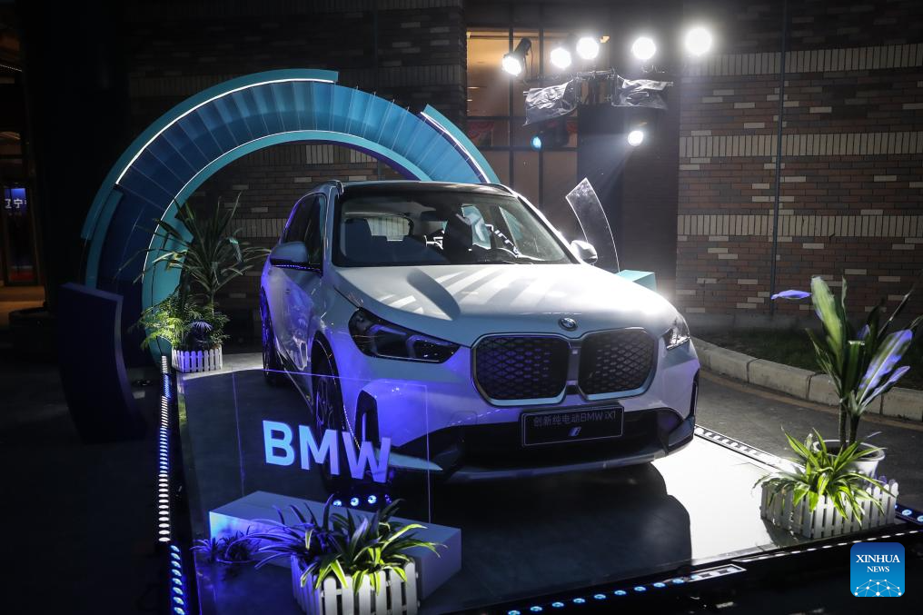 This photo taken on April 26, 2024 shows a BMW electric vehicle displayed at the signing ceremony for deepening strategic cooperation between BMW and Shenyang, in Shenyang, northeast China's Liaoning Province. German carmaker BMW announced on Friday an additional investment of 20 billion yuan (about 2.81 billion U.S. dollars) in its production base in Shenyang, capital of northeast China's Liaoning Province. (Xinhua/Pan Yulong)
