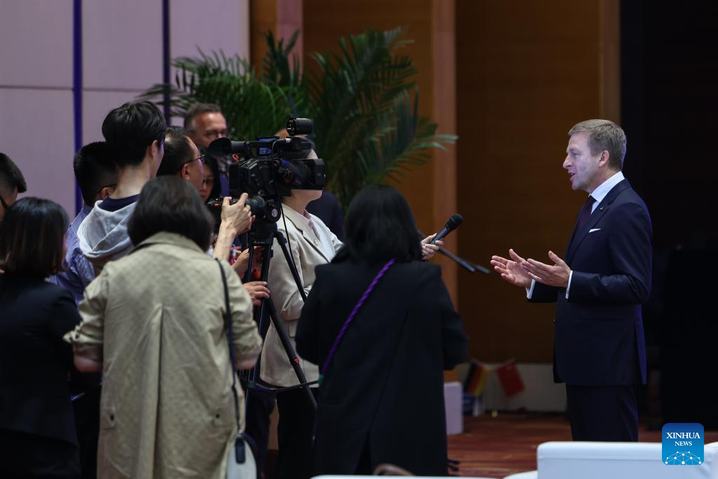 Oliver Zipse, chairman of the Board of Management of BMW AG, speaks during an interview in Shenyang, northeast China's Liaoning Province, April 26, 2024. German carmaker BMW announced on Friday an additional investment of 20 billion yuan (about 2.81 billion U.S. dollars) in its production base in Shenyang, capital of northeast China's Liaoning Province. (Xinhua/Pan Yulong)
