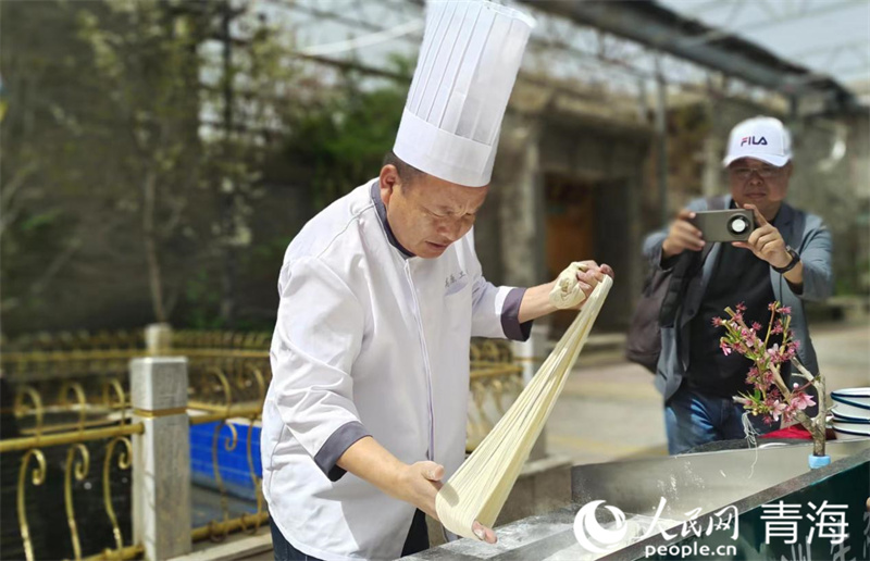 A cook expertly displays his skills of making lamian noodles, a specialty cuisine, in Hualong Hui Autonomous County, Haidong city, northwest China's Qinghai Province. These lamian noodles are known for being thin enough to thread a needle. (People's Daily Online/Ma Kexin)