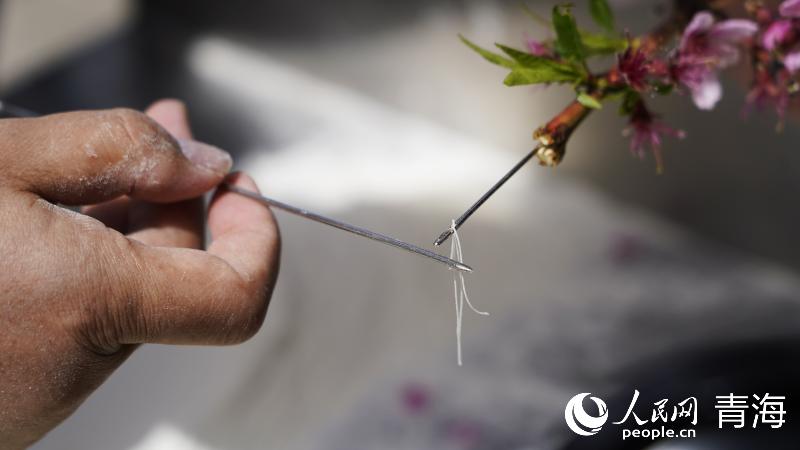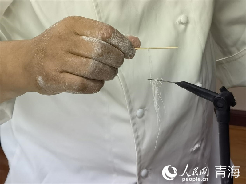 A cook threads a needle with lamian noodles in Hualong Hui Autonomous County, Haidong city, northwest China's Qinghai Province. (People's Daily Online/Ma Kexin)
