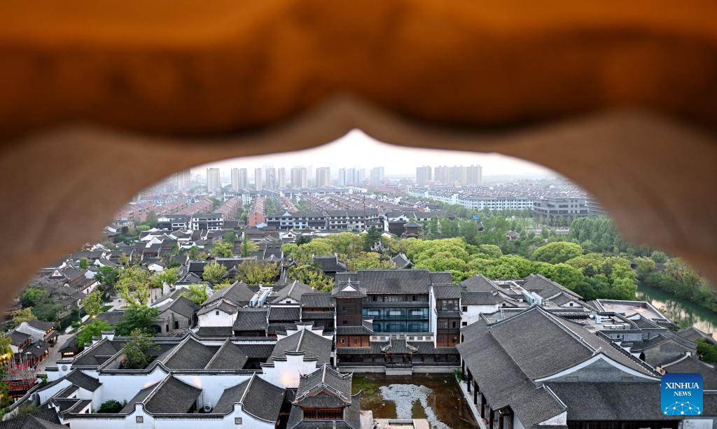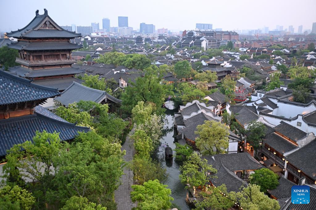 This photo shows a view of the Puyuan Fashion Resort in Jiaxing of east China's Zhejiang Province, April 26, 2024. Paying tribute to the elegant aesthetics of the Song Dynasty (960-1279), the heyday of ancient Chinese art, while combing modern elements, the Puyuan Fashion Resort in Jiaxing of east China's Zhejiang Province offers an immersive cultural travel experience to visitors, ranging from Hanfu fashion shows to themed markets, concerts and sports games. (Xinhua/Mu Yu)
