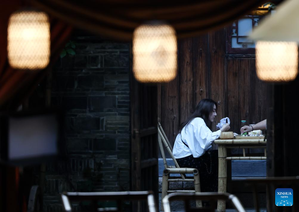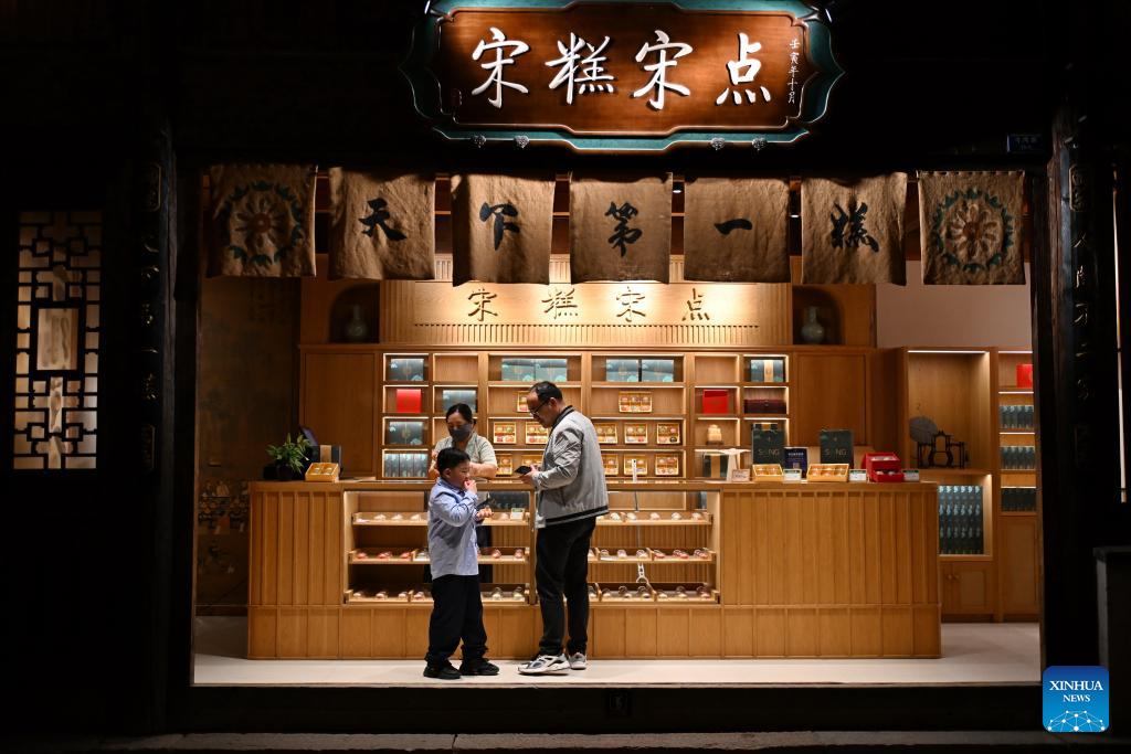 Tourists buy snacks at the Puyuan Fashion Resort in Jiaxing of east China's Zhejiang Province, April 26, 2024. Paying tribute to the elegant aesthetics of the Song Dynasty (960-1279), the heyday of ancient Chinese art, while combing modern elements, the Puyuan Fashion Resort in Jiaxing of east China's Zhejiang Province offers an immersive cultural travel experience to visitors, ranging from Hanfu fashion shows to themed markets, concerts and sports games. (Xinhua/Mu Yu)