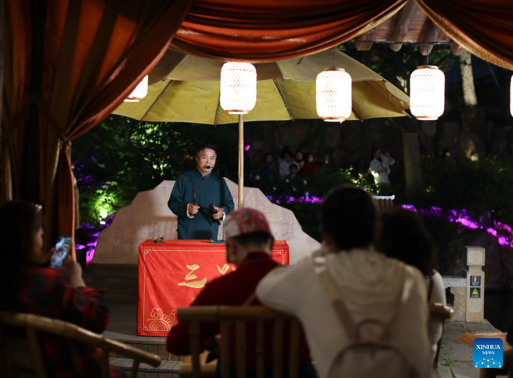 Tourists watch a performance at the Puyuan Fashion Resort in Jiaxing of east China's Zhejiang Province, April 26, 2024. Paying tribute to the elegant aesthetics of the Song Dynasty (960-1279), the heyday of ancient Chinese art, while combing modern elements, the Puyuan Fashion Resort in Jiaxing of east China's Zhejiang Province offers an immersive cultural travel experience to visitors, ranging from Hanfu fashion shows to themed markets, concerts and sports games. (Xinhua/Sun Fanyue)