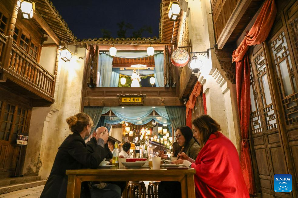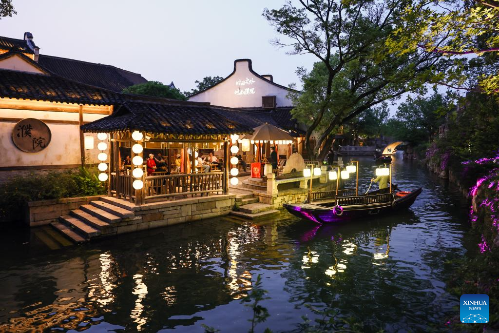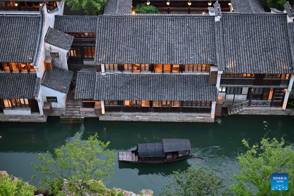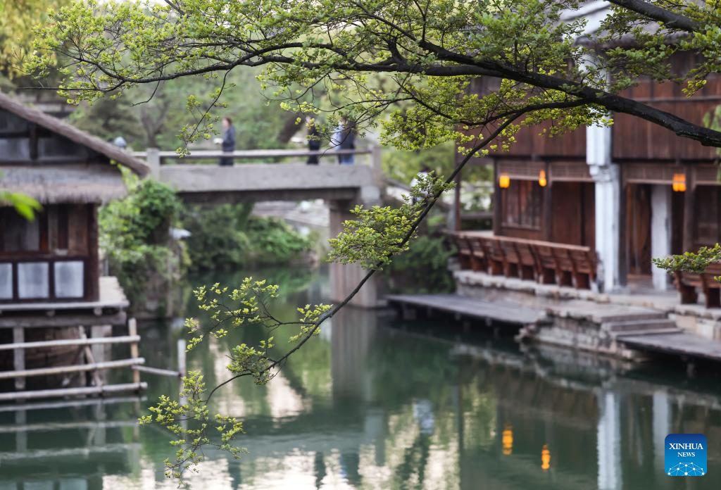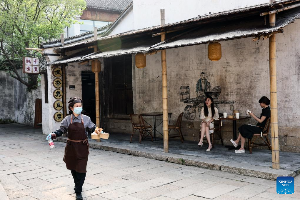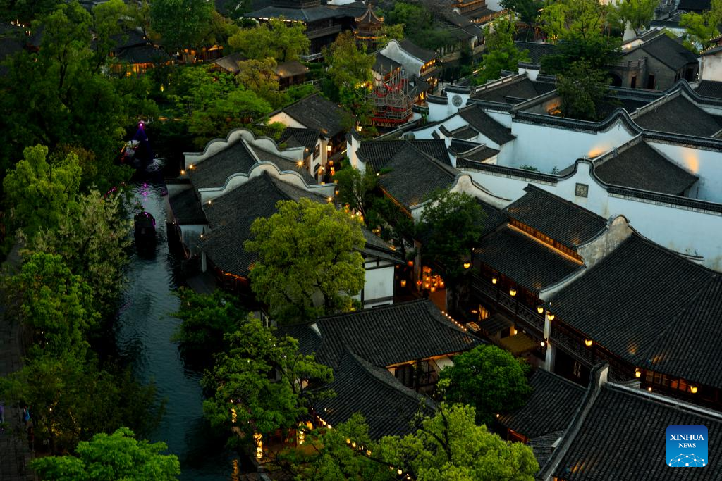 The Puyuan Fashion Resort is seen in Jiaxing of east China's Zhejiang Province, April 26, 2024. Paying tribute to the elegant aesthetics of the Song Dynasty (960-1279), the heyday of ancient Chinese art, while combing modern elements, the Puyuan Fashion Resort in Jiaxing of east China's Zhejiang Province offers an immersive cultural travel experience to visitors, ranging from Hanfu fashion shows to themed markets, concerts and sports games. (Xinhua/Liu Chan)
