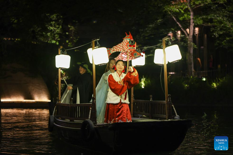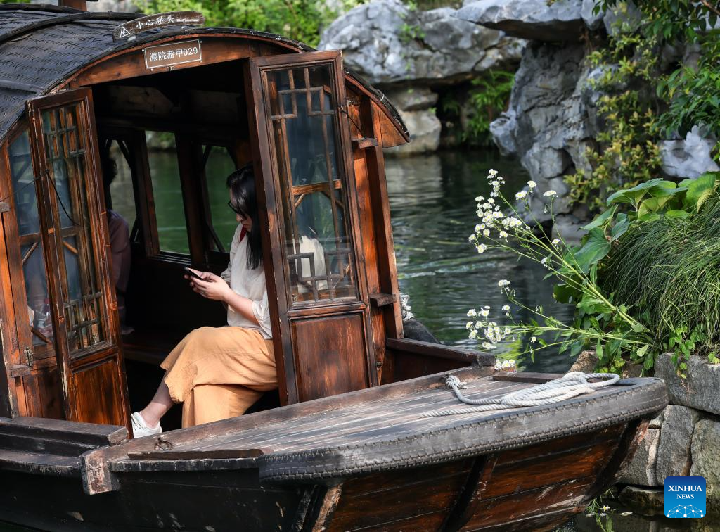 A tourist takes a boat at the Puyuan Fashion Resort in Jiaxing of east China's Zhejiang Province, April 26, 2024. Paying tribute to the elegant aesthetics of the Song Dynasty (960-1279), the heyday of ancient Chinese art, while combing modern elements, the Puyuan Fashion Resort in Jiaxing of east China's Zhejiang Province offers an immersive cultural travel experience to visitors, ranging from Hanfu fashion shows to themed markets, concerts and sports games. (Xinhua/Lan Hongguang)