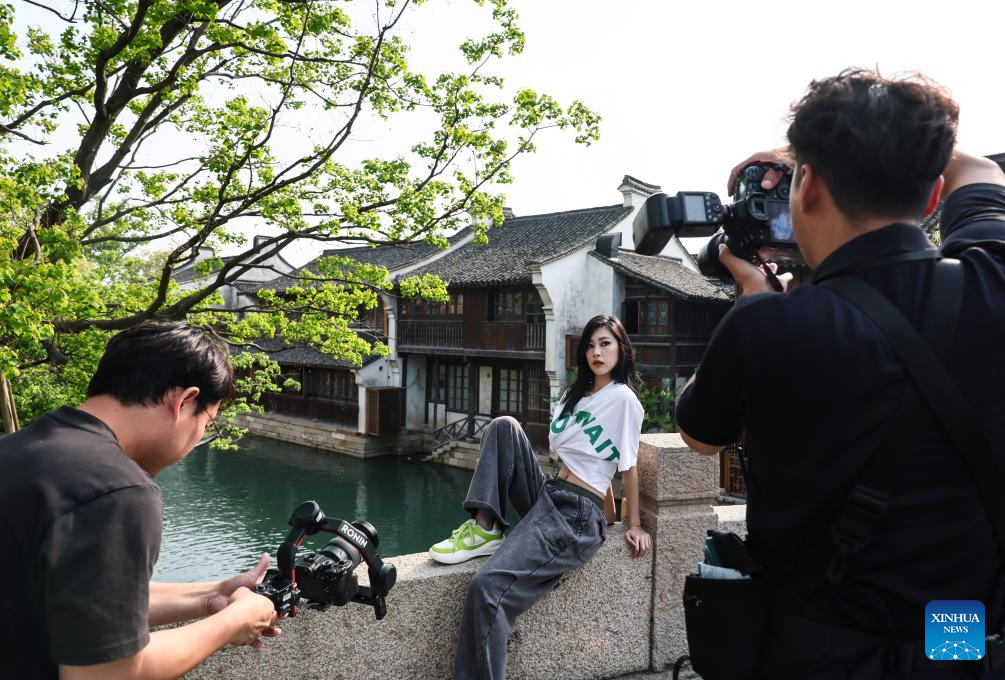 A model poses for photos at the Puyuan Fashion Resort in Jiaxing of east China's Zhejiang Province, April 26, 2024. Paying tribute to the elegant aesthetics of the Song Dynasty (960-1279), the heyday of ancient Chinese art, while combing modern elements, the Puyuan Fashion Resort in Jiaxing of east China's Zhejiang Province offers an immersive cultural travel experience to visitors, ranging from Hanfu fashion shows to themed markets, concerts and sports games. (Xinhua/Lan Hongguang)