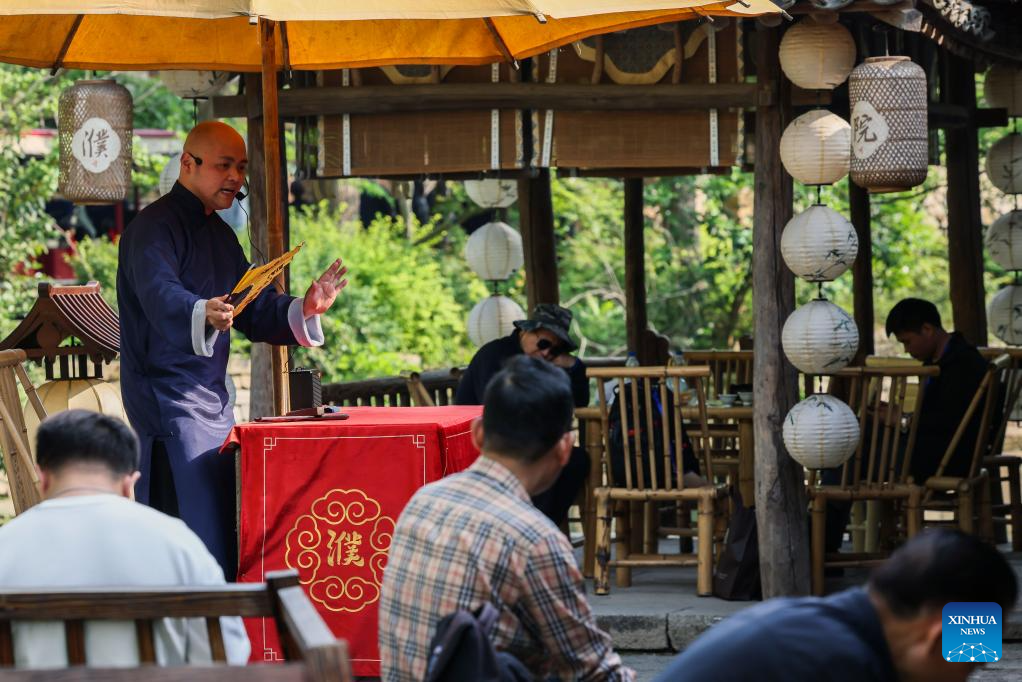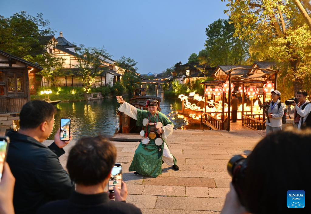 An actor performs for tourists at the Puyuan Fashion Resort in Jiaxing of east China's Zhejiang Province, April 26, 2024. Paying tribute to the elegant aesthetics of the Song Dynasty (960-1279), the heyday of ancient Chinese art, while combing modern elements, the Puyuan Fashion Resort in Jiaxing of east China's Zhejiang Province offers an immersive cultural travel experience to visitors, ranging from Hanfu fashion shows to themed markets, concerts and sports games. (Xinhua/Wang Jingqiang)