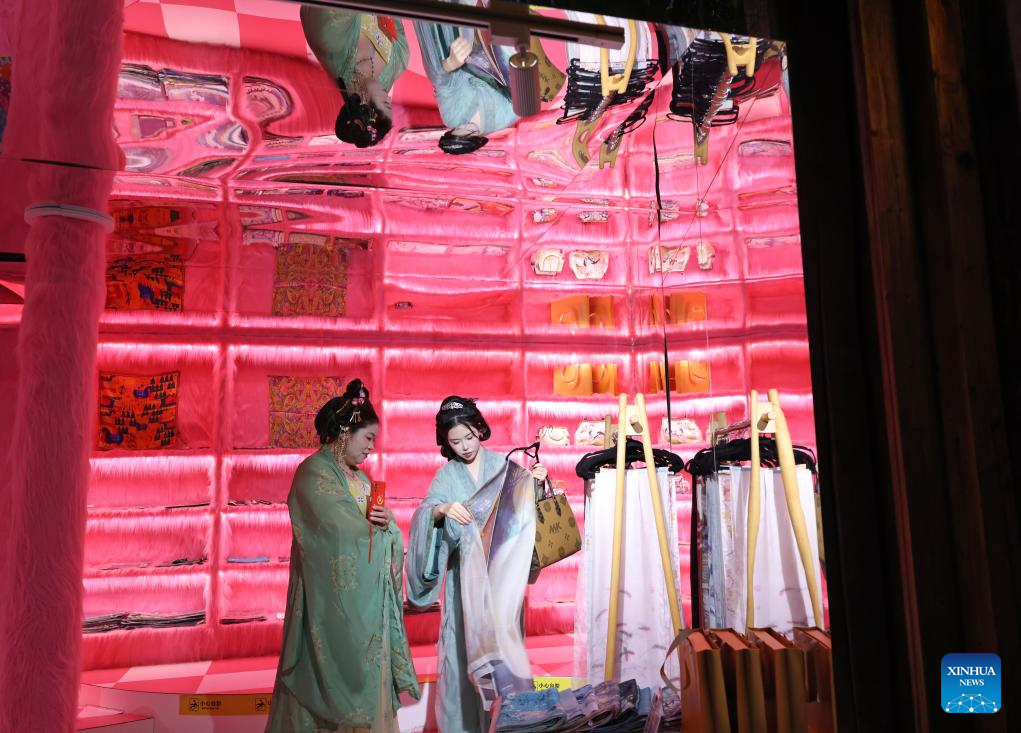 Tourists buy textiles at the Puyuan Fashion Resort in Jiaxing of east China's Zhejiang Province, April 26, 2024. Paying tribute to the elegant aesthetics of the Song Dynasty (960-1279), the heyday of ancient Chinese art, while combing modern elements, the Puyuan Fashion Resort in Jiaxing of east China's Zhejiang Province offers an immersive cultural travel experience to visitors, ranging from Hanfu fashion shows to themed markets, concerts and sports games. (Xinhua/Liu Ying)