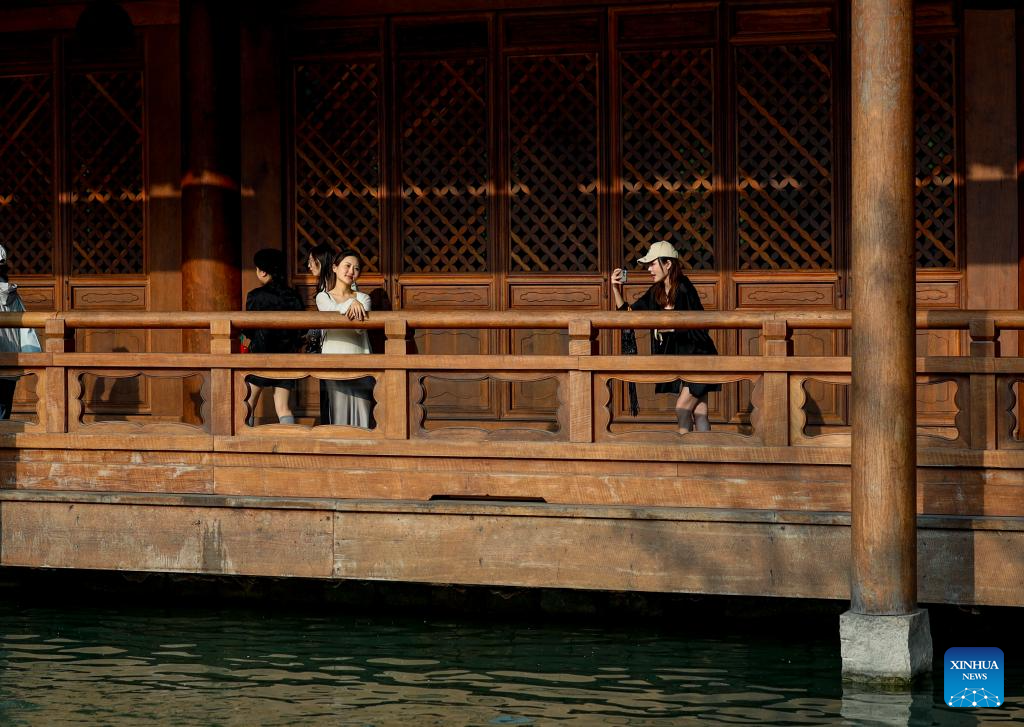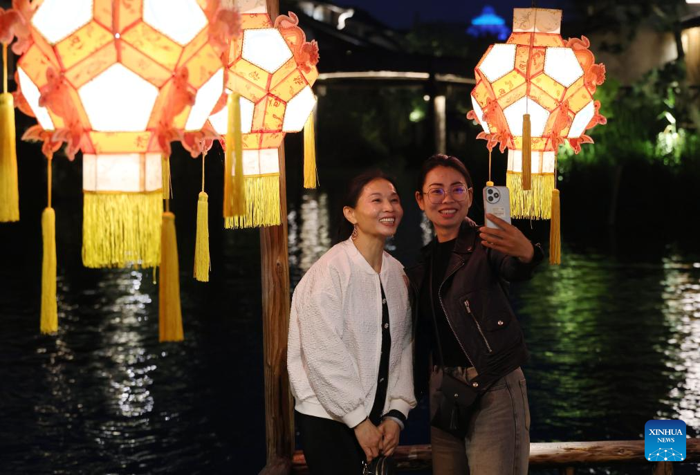 Visitors take selfies at the Puyuan Fashion Resort in Jiaxing of east China's Zhejiang Province, April 26, 2024. Paying tribute to the elegant aesthetics of the Song Dynasty (960-1279), the heyday of ancient Chinese art, while combing modern elements, the Puyuan Fashion Resort in Jiaxing of east China's Zhejiang Province offers an immersive cultural travel experience to visitors, ranging from Hanfu fashion shows to themed markets, concerts and sports games. (Xinhua/Liu Ying)