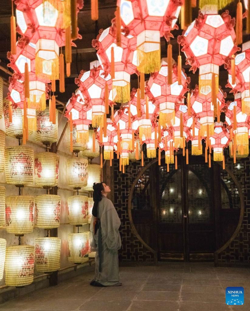 A tourist visits the Puyuan Fashion Resort in Jiaxing of east China's Zhejiang Province, April 26, 2024. Paying tribute to the elegant aesthetics of the Song Dynasty (960-1279), the heyday of ancient Chinese art, while combing modern elements, the Puyuan Fashion Resort in Jiaxing of east China's Zhejiang Province offers an immersive cultural travel experience to visitors, ranging from Hanfu fashion shows to themed markets, concerts and sports games. (Xinhua/Jigme Dorje)