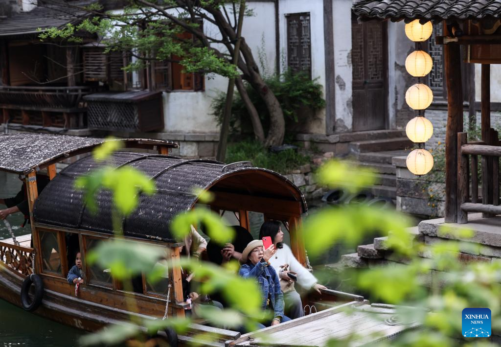 Tourists take a boat at the Puyuan Fashion Resort in Jiaxing of east China's Zhejiang Province, April 26, 2024. Paying tribute to the elegant aesthetics of the Song Dynasty (960-1279), the heyday of ancient Chinese art, while combing modern elements, the Puyuan Fashion Resort in Jiaxing of east China's Zhejiang Province offers an immersive cultural travel experience to visitors, ranging from Hanfu fashion shows to themed markets, concerts and sports games. (Xinhua/Lan Hongguang)