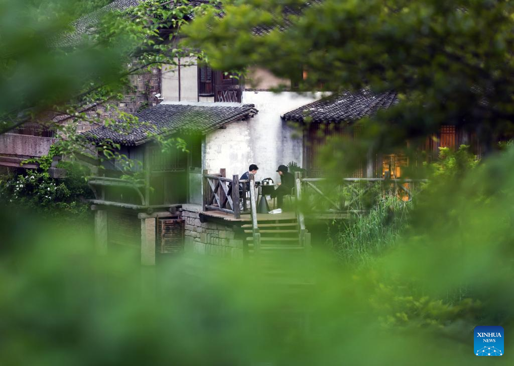 Tourists play a game of Go at the Puyuan Fashion Resort in Jiaxing of east China's Zhejiang Province, April 26, 2024. Paying tribute to the elegant aesthetics of the Song Dynasty (960-1279), the heyday of ancient Chinese art, while combing modern elements, the Puyuan Fashion Resort in Jiaxing of east China's Zhejiang Province offers an immersive cultural travel experience to visitors, ranging from Hanfu fashion shows to themed markets, concerts and sports games. (Xinhua/Lan Hongguang)