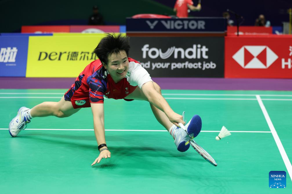 He Bingjiao of China hits a return in the singles match against Michelle Li of Canada during the group A match between China and Canada at BWF Uber Cup Finals in Chengdu, southwest China's Sichuan Province, April 28, 2024. (Xinhua/Chen Bin)