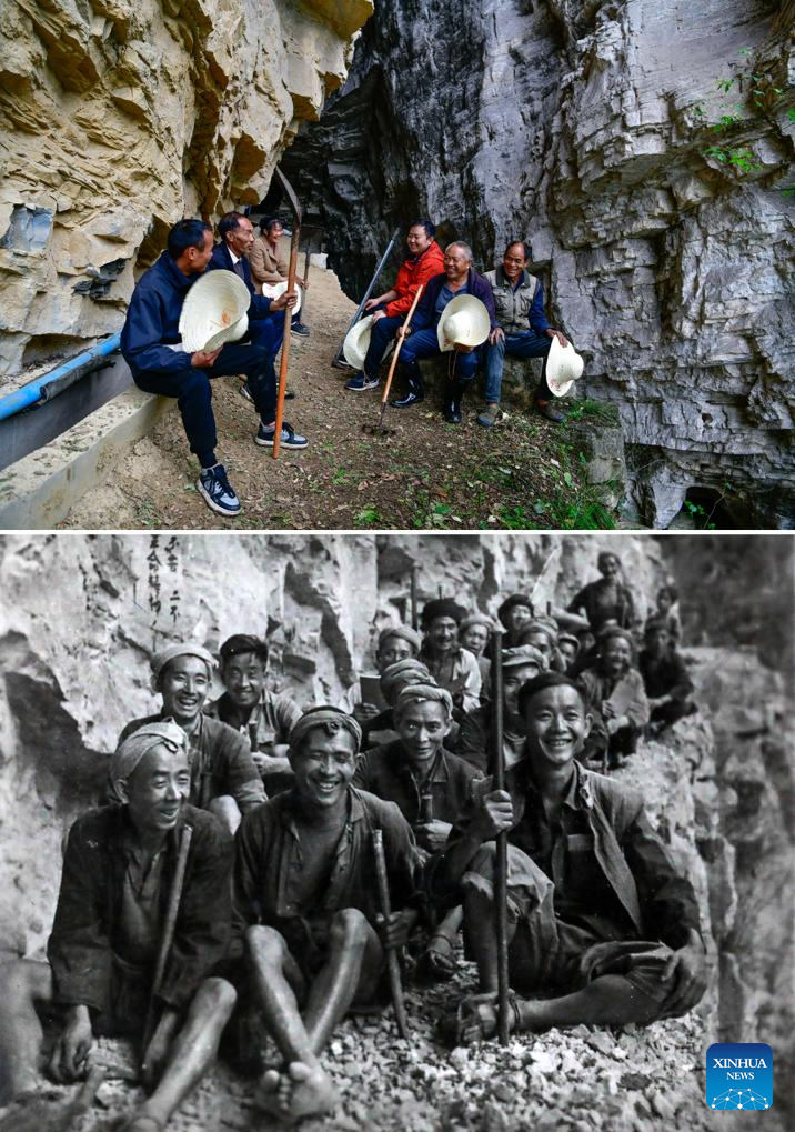 This combo photo shows members of a canal maintenance team patrolling a canal on the cliffs on April 24, 2024 (L, photo by Xinhua photographer Yang Wenbin), and members of a canal construction team building a canal on the cliffs in 1960 (R, photo by Wang Zhenxiang), in Shengji Township of Bijie City, southwest China's Guizhou Province.