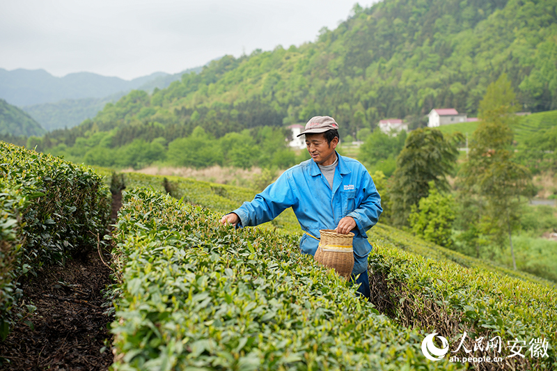 A farmer picks tea leaves in Dongzhi county, east China's Anhui Province. (People's Daily Online/Wang Rui)