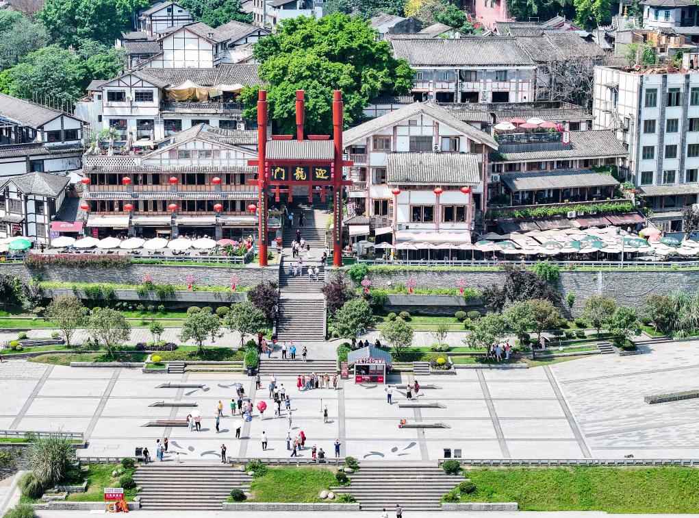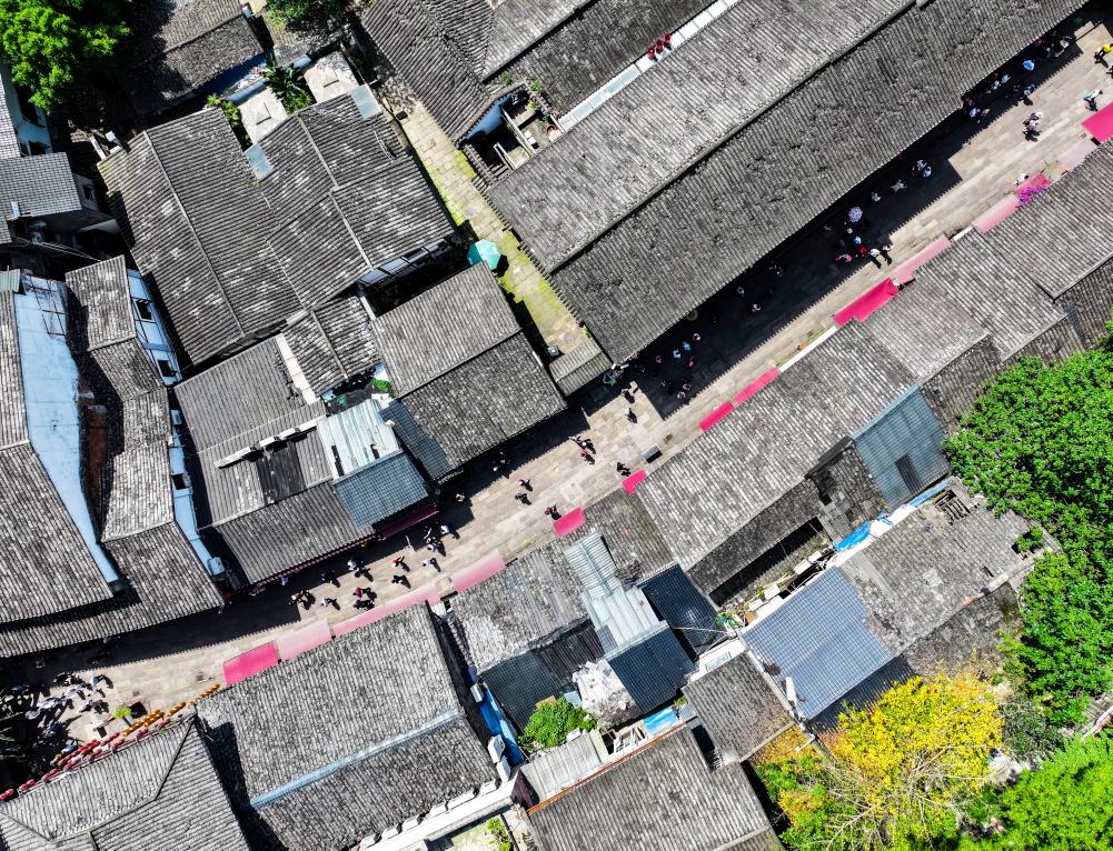 An aerial drone photo taken on April 28, 2024 shows tourists visiting the Ciqikou ancient town in southwest China's Chongqing Municipality. (Xinhua/Wang Quanchao)
