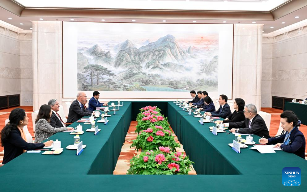 Chinese Vice President Han Zheng meets with Minister of Foreign Affairs of Peru Javier Gonzalez-Olaechea Franco in Beijing, capital of China, April 29, 2024. (Xinhua/Yin Bogu)