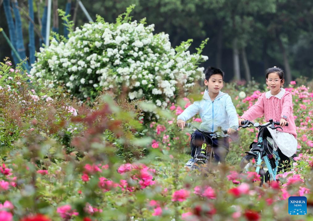 Children ride bicycles at the botanical garden in Jiaxing City, east China's Zhejiang Province, April 27, 2024. Recently, Jiaxing Botanical Garden completed a new round of renovation and attracted many tourists. (Xinhua/Lan Hongguang)