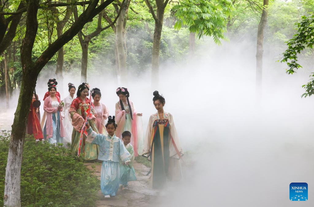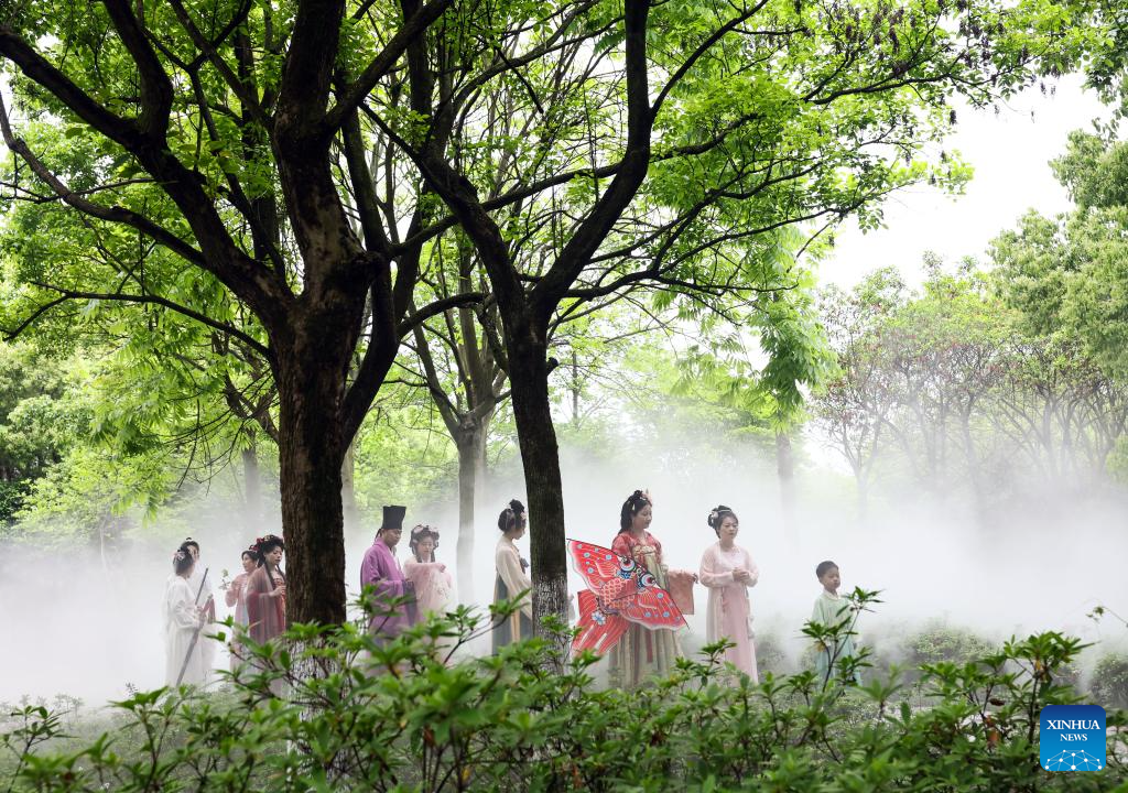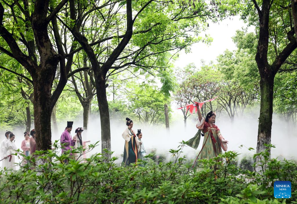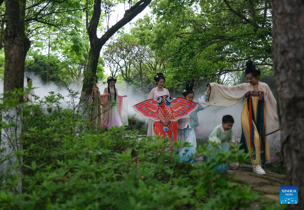 Tourists donning traditional Hanfu attire visit the botanical garden in Jiaxing City, east China's Zhejiang Province, April 27, 2024. Recently, Jiaxing Botanical Garden completed a new round of renovation and attracted many tourists. (Xinhua/Jigme Dorje)