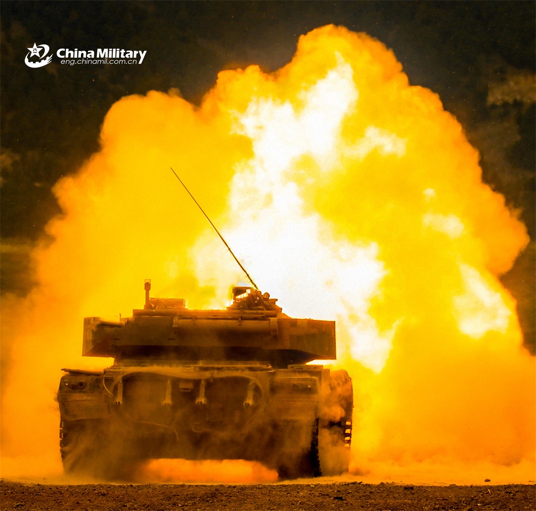 A main battle tank (MBT) attached to a tank detachment of a brigade under the PLA 71st Group Army spits fire on simulated targets during a live-fire training exercise on April 17, 2024. (eng.chinamil.com.cn/Photo by Wan Zhiqi)