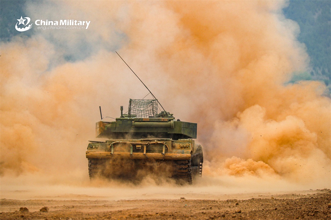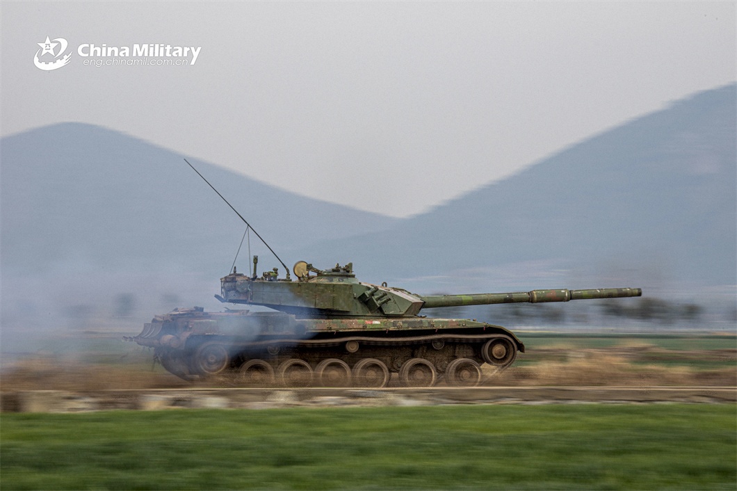 A main battle tank (MBT) attached to a tank detachment of a brigade under the PLA 71st Group Army rumbles on the field during a live-fire training exercise on April 17, 2024. (eng.chinamil.com.cn/Photo by Wan Zhiqi)