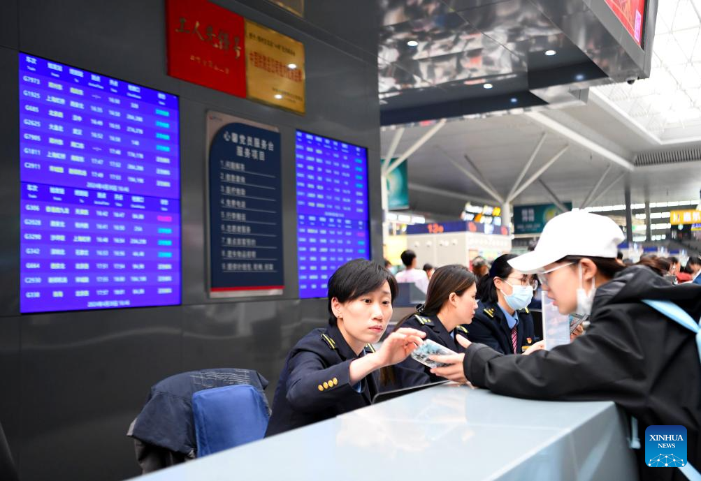 Passengers inquire information at the service desk of Xuzhou East Railway Station in Xuzhou, east China's Jiangsu Province, on April 30, 2024. China's railway network is expected to handle 144 million passenger trips during the eight-day May Day holiday travel rush, the China State Railway Group Co., Ltd. said Monday. (Xinhua/Mao Jun)