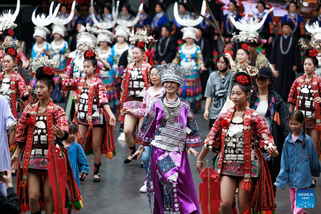 Staff members of the scenic spot greet tourists at Xijiang Qianhu Miao Village in Leishan County of Qiandongnan Miao and Dong Autonomous Prefecture, southwest China's Guizhou Province, on April 30, 2024. As the May Day holiday is approaching, the village held many activities such as basketball match, costume show and song and dance performances to welcome tourists. (Xinhua/Liu Xu)