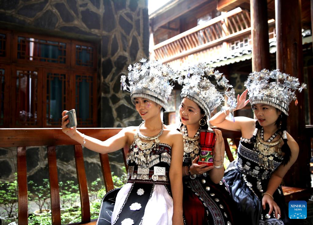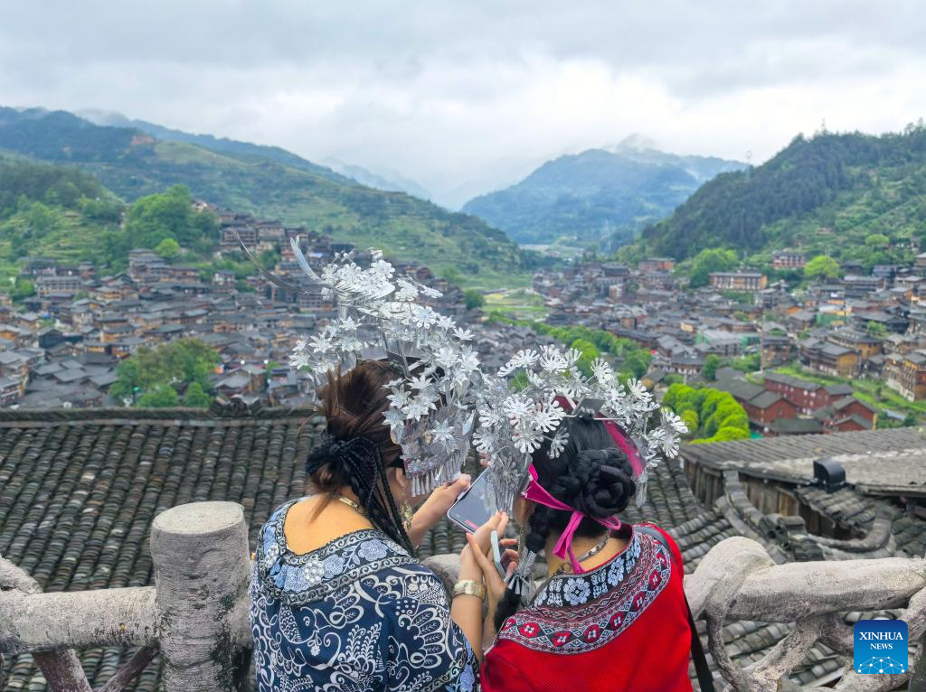 Tourists donning traditional ethnic attire take selfies at Xijiang Qianhu Miao Village in Leishan County of Qiandongnan Miao and Dong Autonomous Prefecture, southwest China's Guizhou Province, on April 30, 2024. As the May Day holiday is approaching, the village held many activities such as basketball match, costume show and song and dance performances to welcome tourists. (Photo by Yu Tianying/Xinhua)