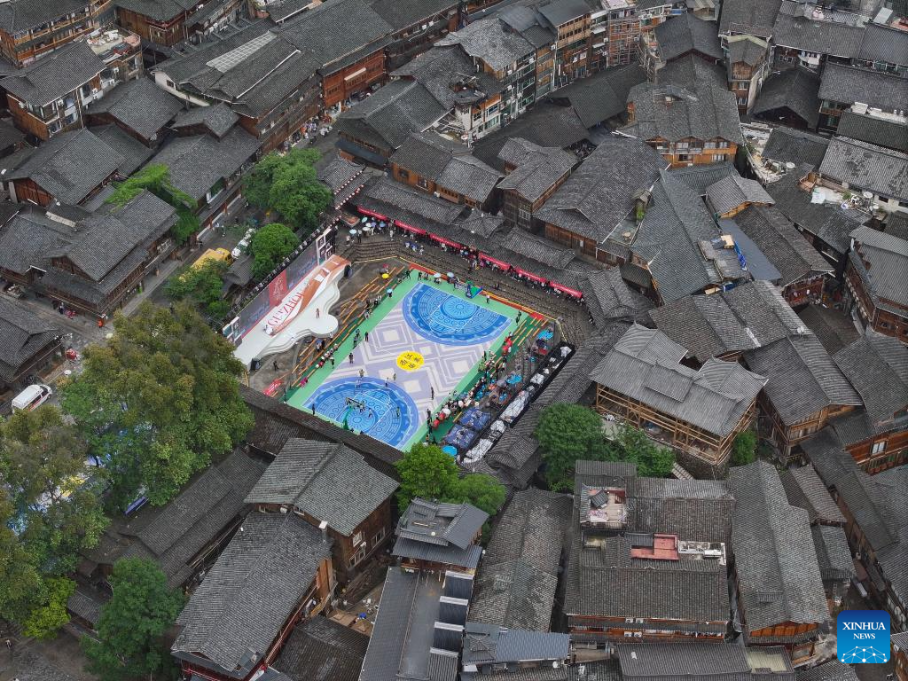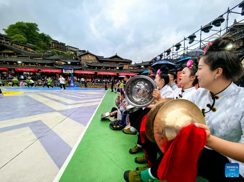 Tourists visit Xijiang Qianhu Miao Village in Leishan County of Qiandongnan Miao and Dong Autonomous Prefecture, southwest China's Guizhou Province, on April 30, 2024. As the May Day holiday is approaching, the village held many activities such as basketball match, costume show and song and dance performances to welcome tourists. (Xinhua/Liu Xu)