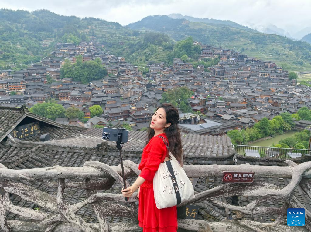 A tourist takes selfies at Xijiang Qianhu Miao Village in Leishan County of Qiandongnan Miao and Dong Autonomous Prefecture, southwest China's Guizhou Province, on April 30, 2024. As the May Day holiday is approaching, the village held many activities such as basketball match, costume show and song and dance performances to welcome tourists. (Xinhua/Liu Xu)