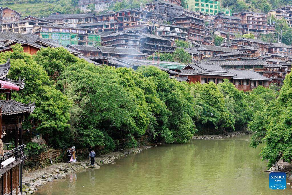Tourists donning traditional ethnic attire visit Xijiang Qianhu Miao Village in Leishan County of Qiandongnan Miao and Dong Autonomous Prefecture, southwest China's Guizhou Province, on April 30, 2024. As the May Day holiday is approaching, the village held many activities such as basketball match, costume show and song and dance performances to welcome tourists. (Xinhua/Liu Xu)