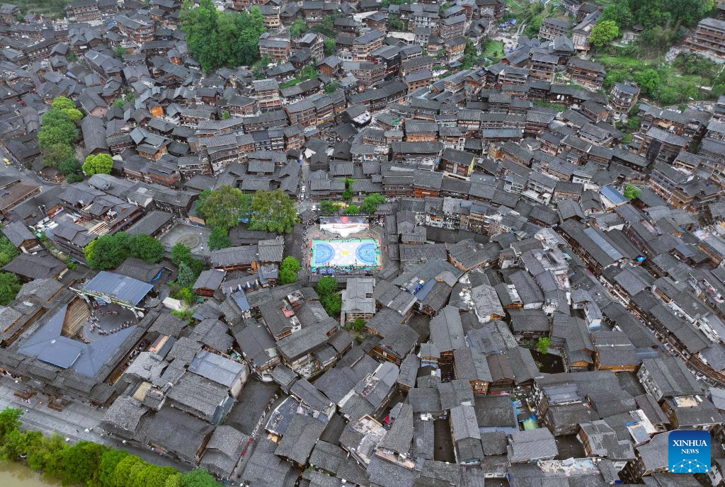 An aerial drone photo taken on April 30, 2024 shows a women's basketball invitational match at Xijiang Qianhu Miao Village in Leishan County of Qiandongnan Miao and Dong Autonomous Prefecture, southwest China's Guizhou Province. As the May Day holiday is approaching, the village held many activities such as basketball match, costume show and song and dance performances to welcome tourists. (Xinhua/Liu Xu)