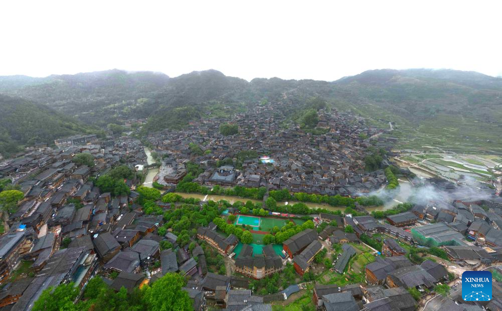 An aerial panoramic drone photo taken on April 30, 2024 shows Xijiang Qianhu Miao Village in Leishan County of Qiandongnan Miao and Dong Autonomous Prefecture, southwest China's Guizhou Province. As the May Day holiday is approaching, the village held many activities such as basketball match, costume show and song and dance performances to welcome tourists. (Photo by Yu Tianying/Xinhua)