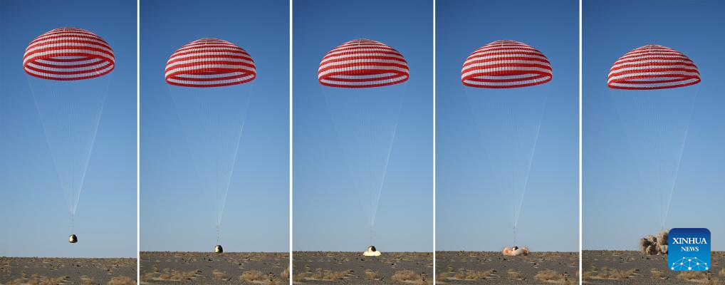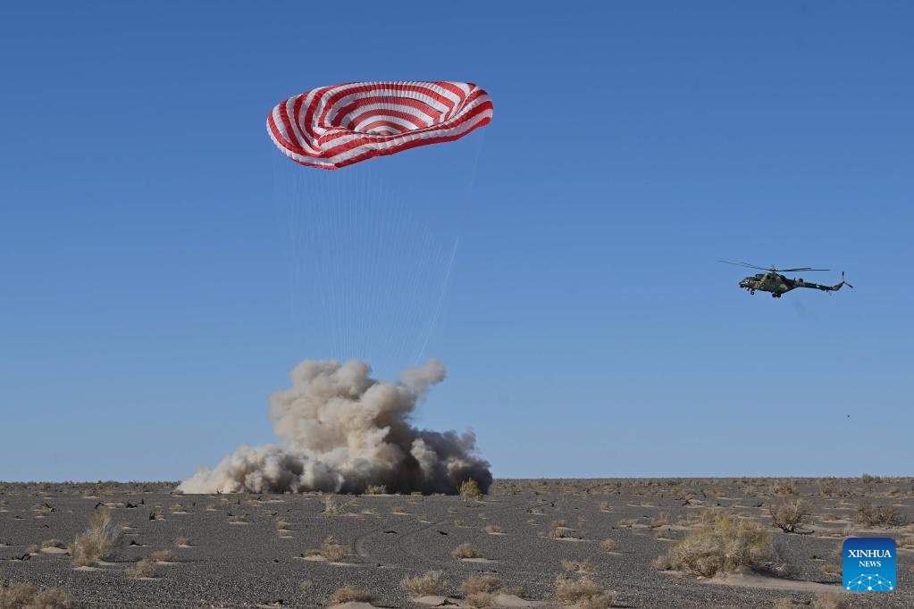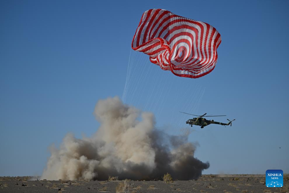The return capsule of the Shenzhou-17 manned spaceship, carrying astronauts Tang Hongbo, Tang Shengjie and Jiang Xinlin, touches down at the Dongfeng landing site in north China's Inner Mongolia Autonomous Region, April 30, 2024. The three astronauts are all in good health condition, according to the China Manned Space Agency. (Xinhua/Bei He)