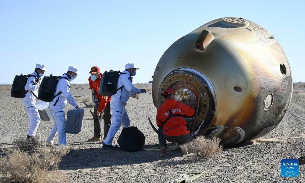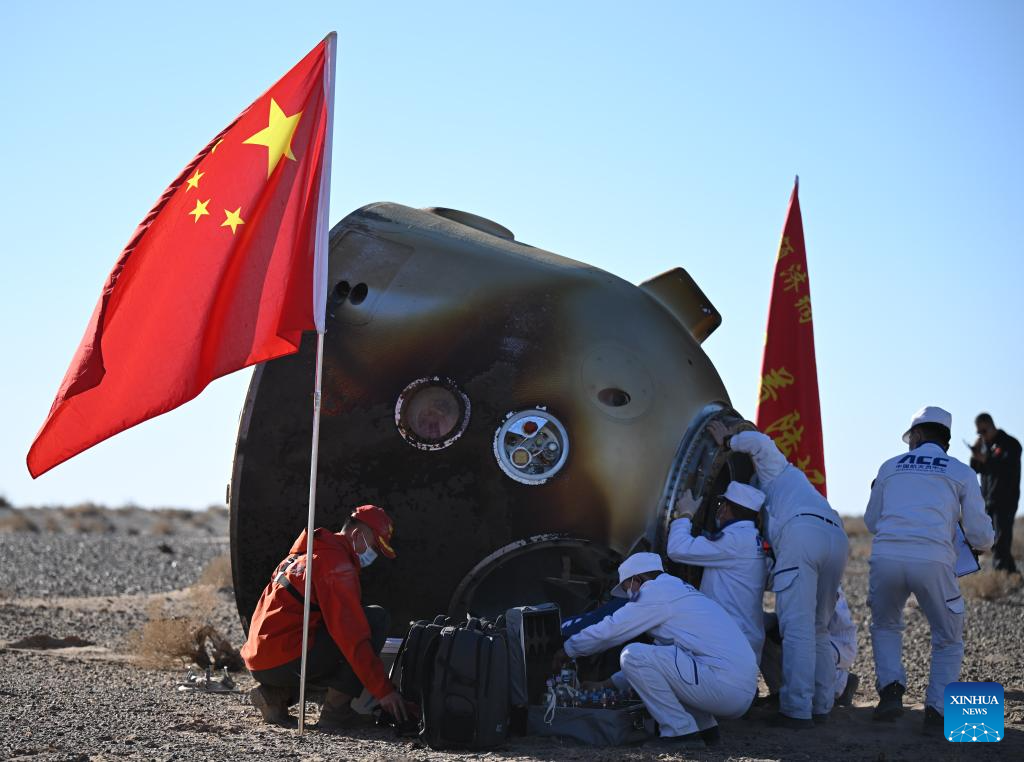 JIUQUAN, April 30 (Xinhua) -- The three astronauts of the Shenzhou-17 manned mission -- Tang Hongbo, Tang Shengjie and Jiang Xinlin -- were all out of the return capsule that touched down at the Dongfeng landing site in north China's Inner Mongolia Autonomous Region on Tuesday.