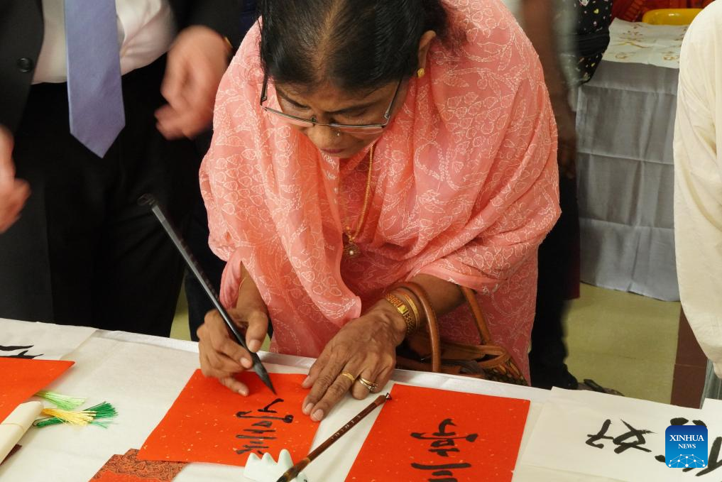A woman tries to write Chinese calligraphy during a celebration of the United Nations Chinese Language Day in Dhaka, Bangladesh, on April 25, 2024. In celebration of the United Nations Chinese Language Day on April 20, a series of colorful cultural activities have allowed more young people to experience the charm of the Chinese language. (Xinhua)